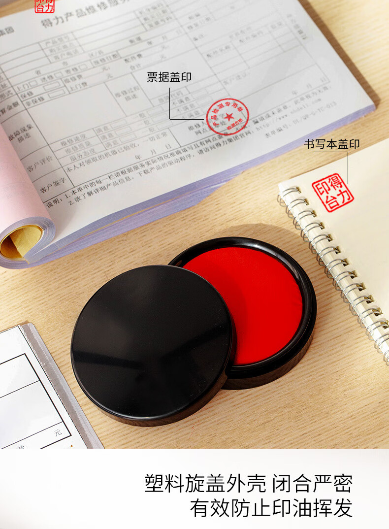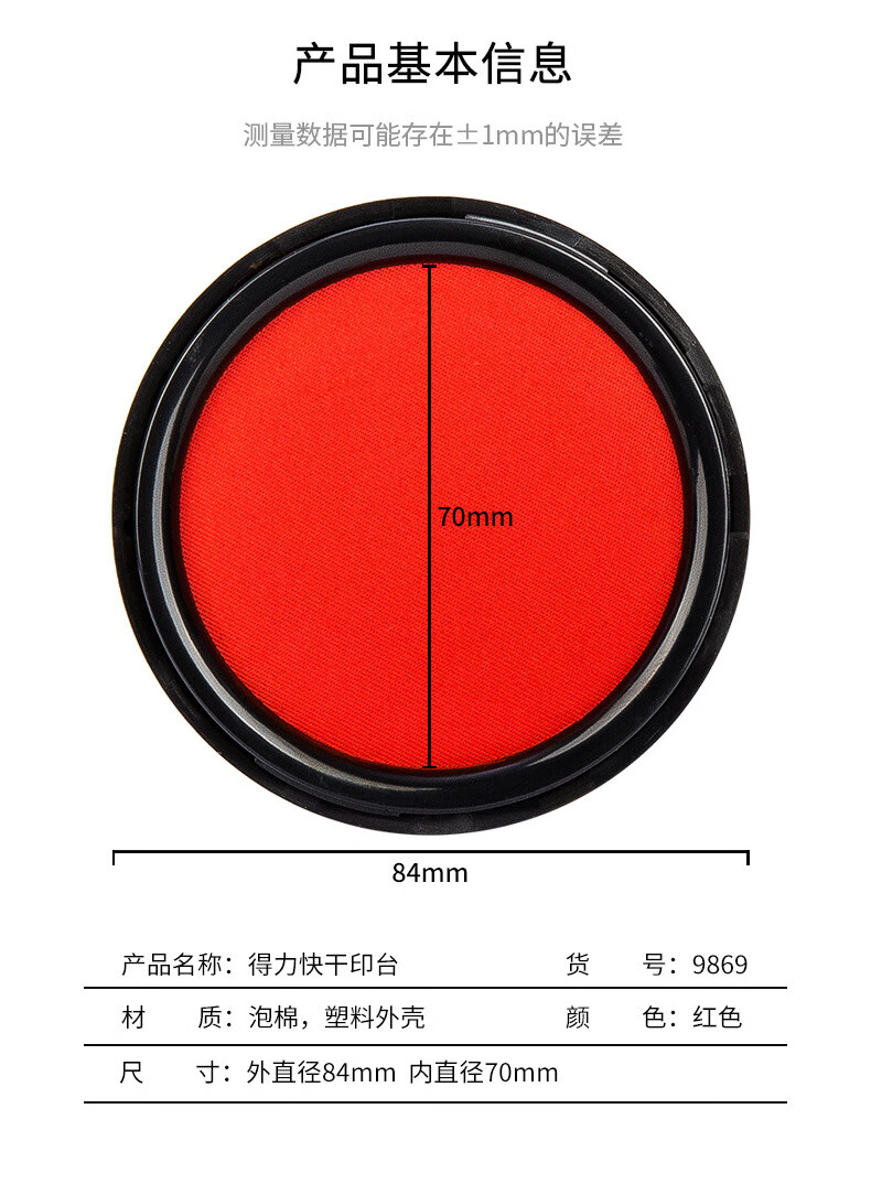 商品名稱:得力9869 印臺(tái) φ84mm圓形塑殼快干印臺(tái)印泥 財(cái)務(wù)辦公用品 紅色(新老包裝混發(fā))