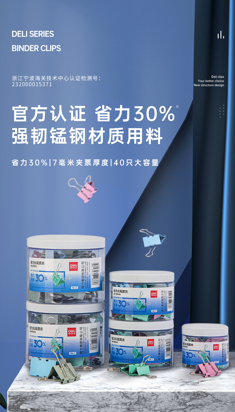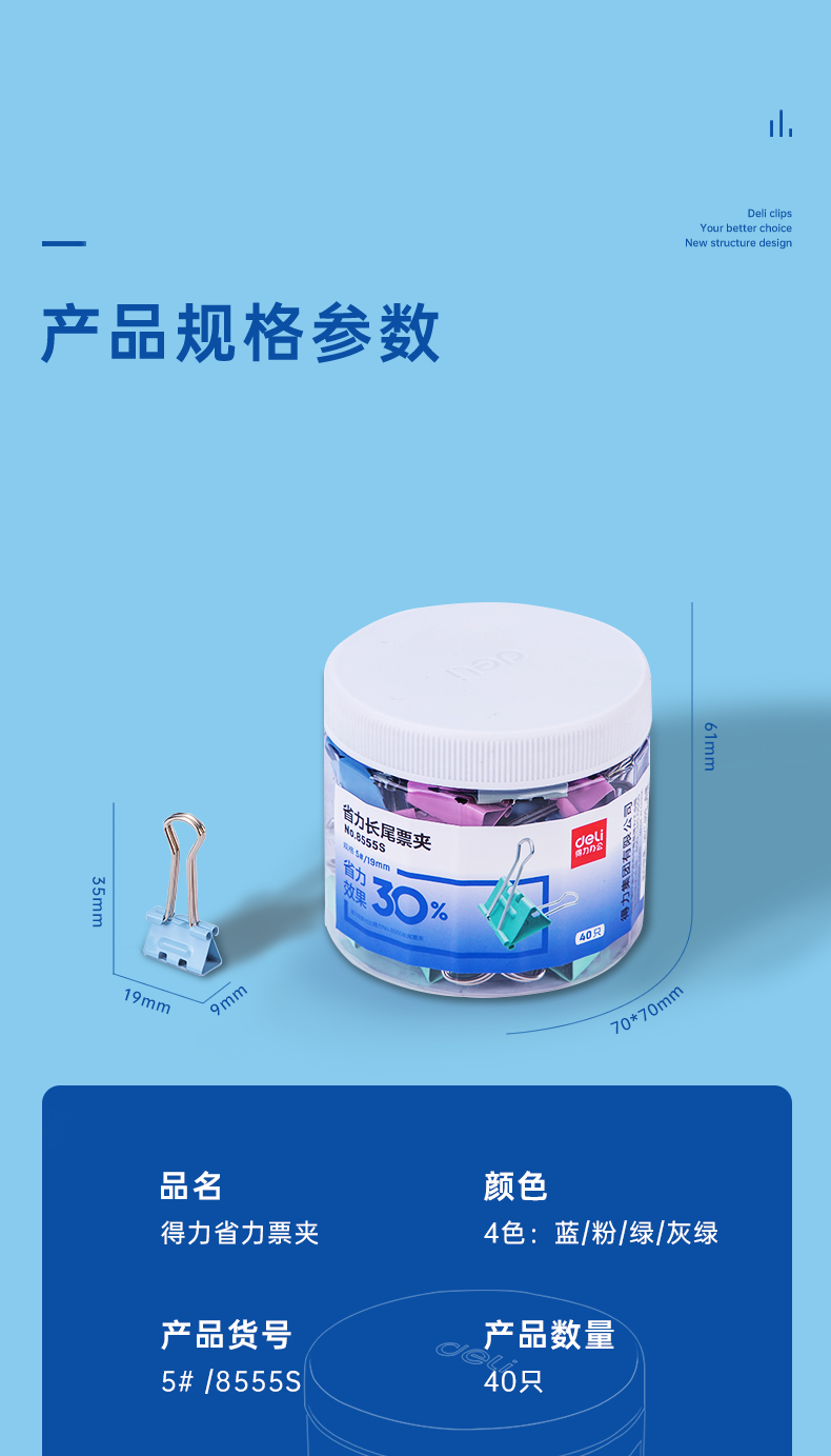 商品名稱:得力8555S 省力長尾夾 5#19mm彩色金屬票夾燕尾夾票據(jù)夾子 辦公用品 40只/筒
