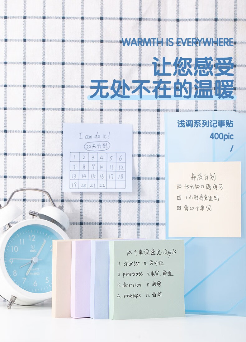 商品名稱:得力21550 便利貼 4色淺調(diào)系列淡彩簡(jiǎn)約便簽本 76*76mm記事貼/自粘留言本 400張/袋