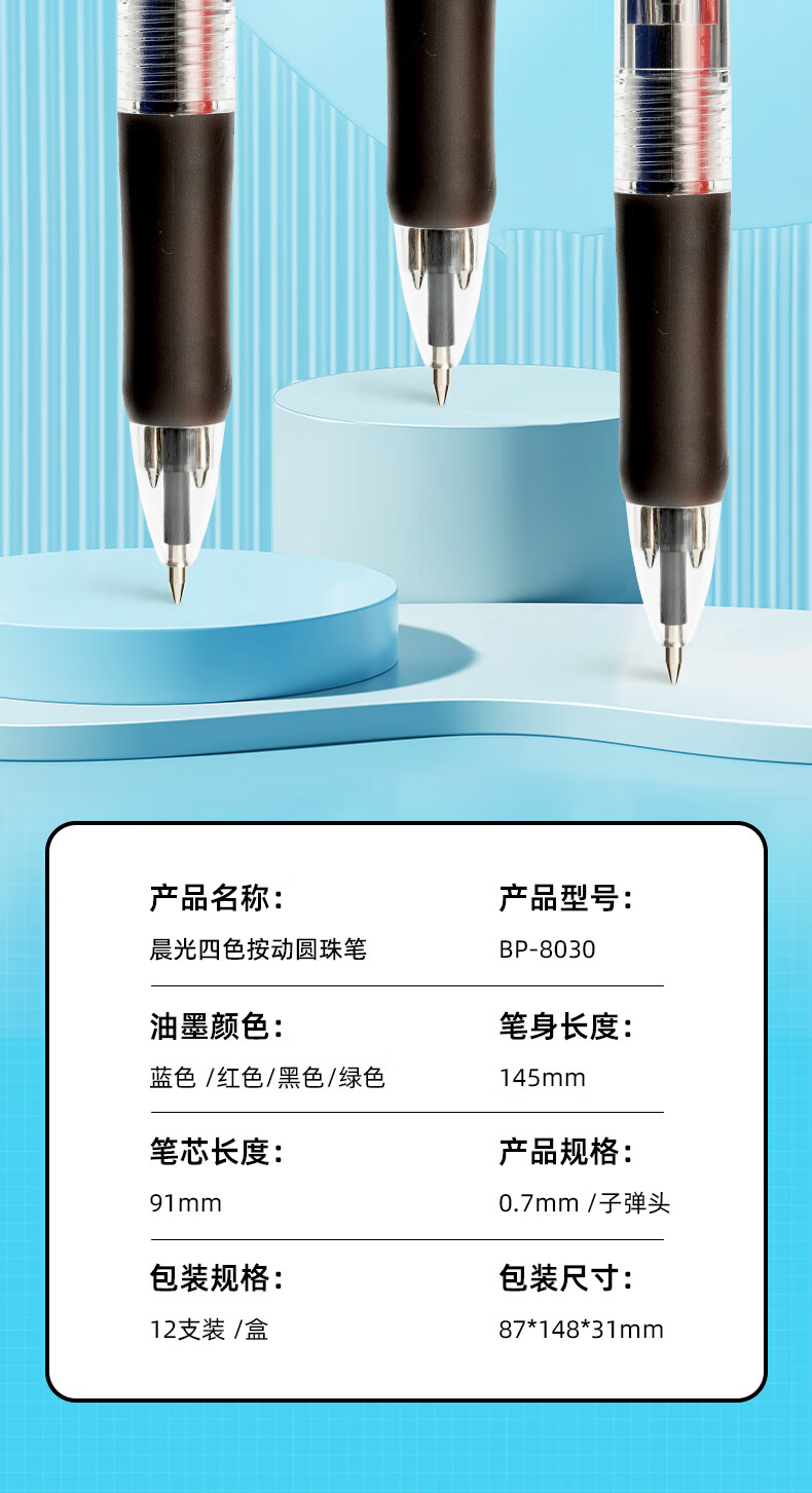 商品名稱:晨光BP8030 彩色按動圓珠筆 0.7mm子彈頭4色原子筆 透明筆桿中油筆 12支/盒