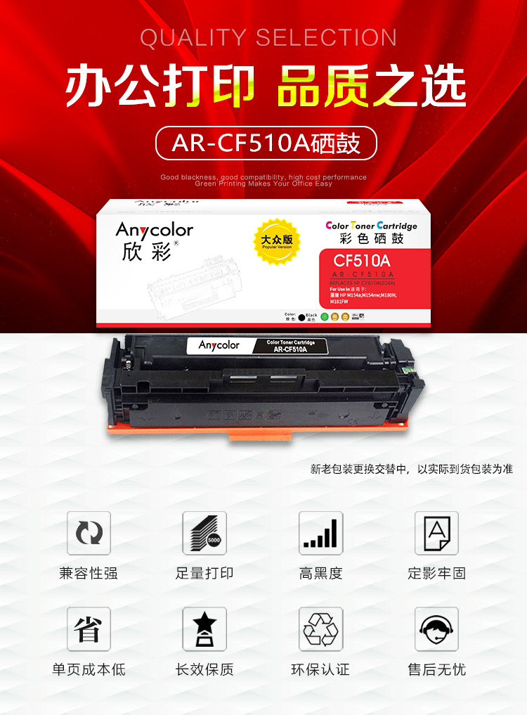 商品名稱:欣彩AR-CF510A黑色硒鼓 大眾版 適用惠普CF510A 204A M154a M154nw MFP M180 M180n M180nw M181