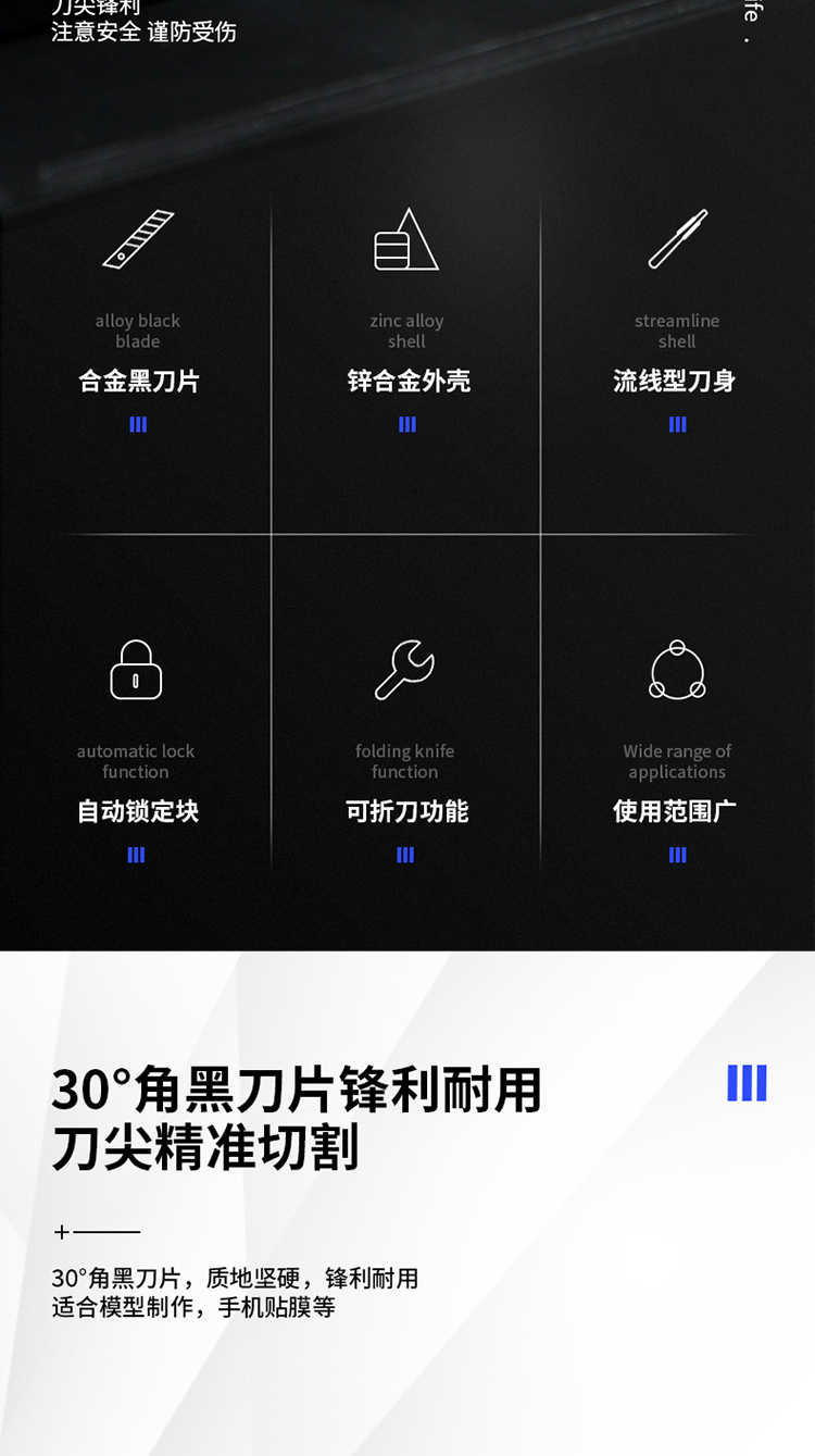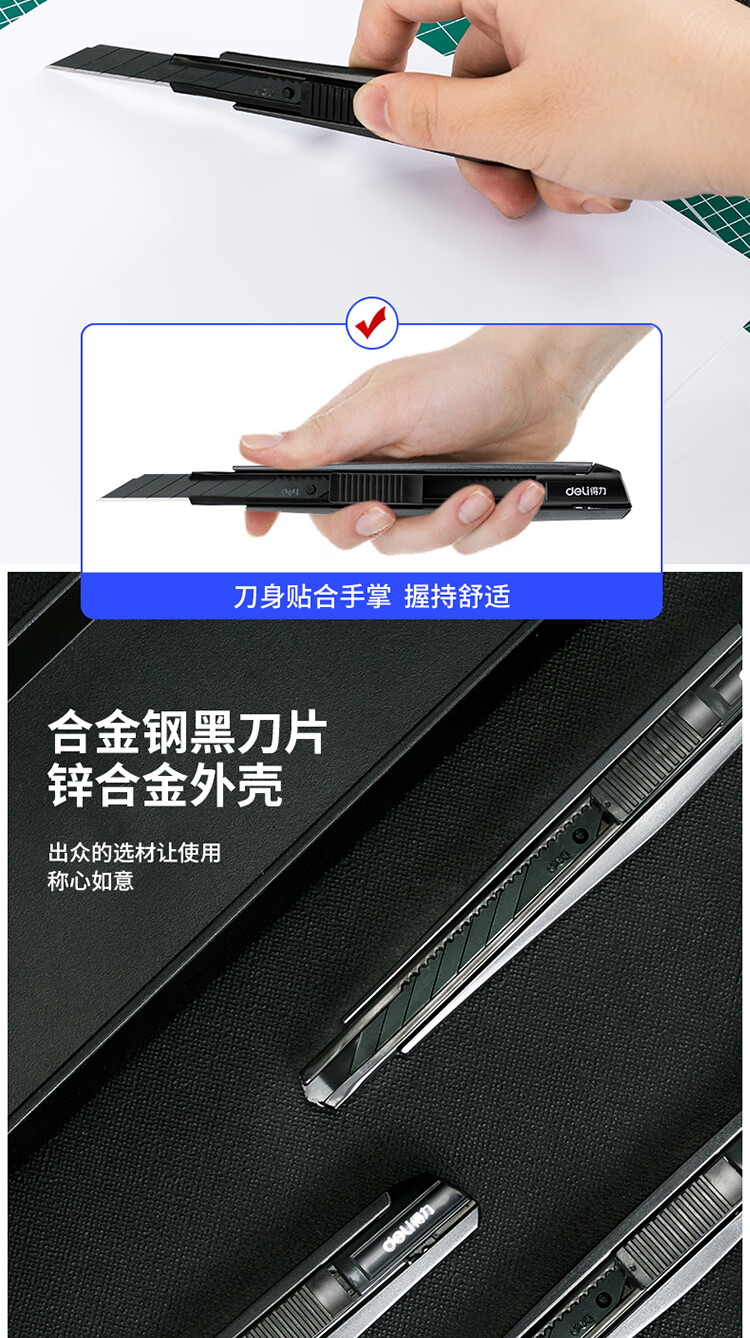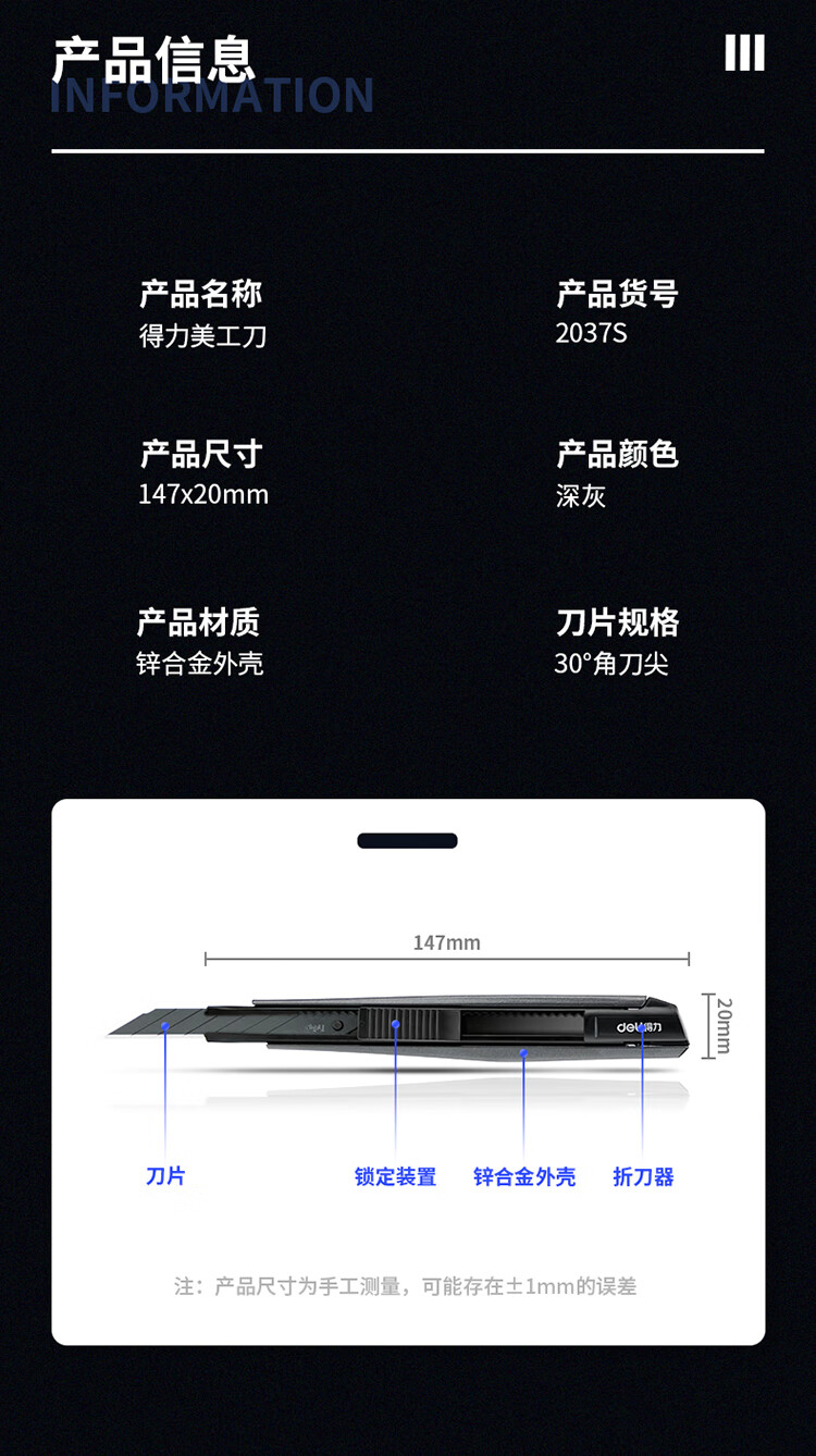 商品名稱:得力2037S 小號美工刀 30°黑刀刃鋅合金裁紙刀/壁紙刀 單位:把